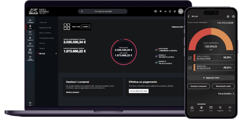 Dalle piattaforme di Banca Generali puoi tenere sotto controllo i saldi disponibili e contabili di tutti i conti correnti collegati, tramite un unico punto di accesso.