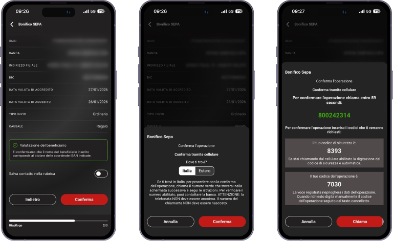 Per autorizzare le tue operazioni la modalità sarà identica a quella dell'accesso, a eccezione delle operazioni rientranti nel perimetro della normativa sui pagamenti digitali "PSD2" (come il bonifico o la ricarica carta prepagata) per le quali sarà necessario digitare un codice aggiuntivo.